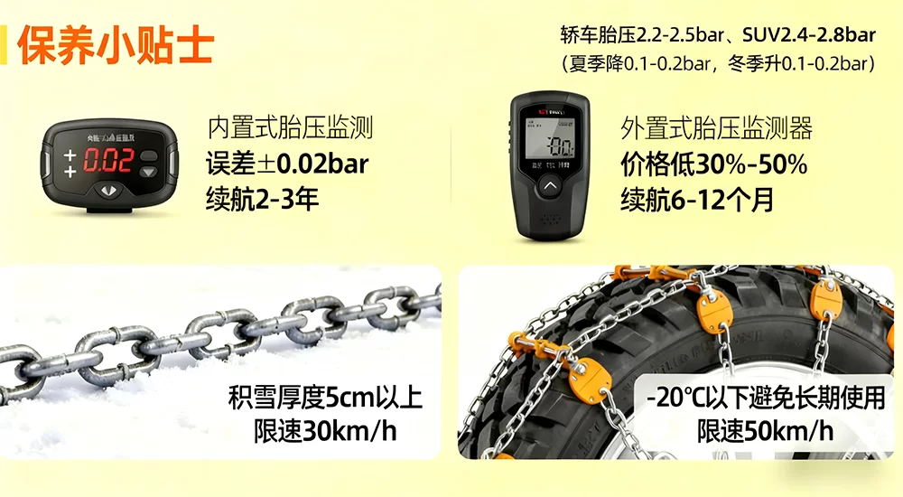 Maintenance Tips Tire accessories: tire pressure monitor and anti-skid chains, extending tire service life